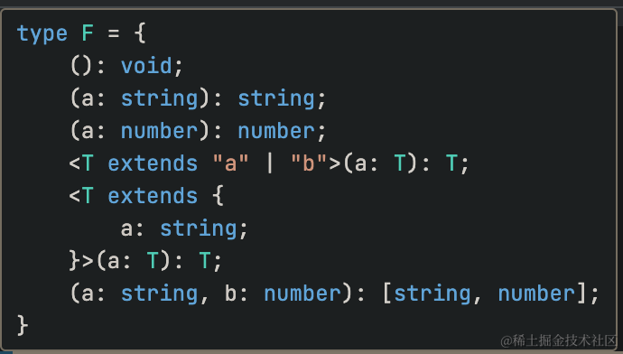 };接着, 试着写出一个OverloadReturnType<T>来获取返回值类型, 但是问题在于 overload 签名的数量不是固定的, 如何来进行定义呢? 这里只能采用一个折中的写法, 把每个方法 签名类型转换到一个 Tuple 类型中, 以下写法最多可以支持 8 个函数重载签名: